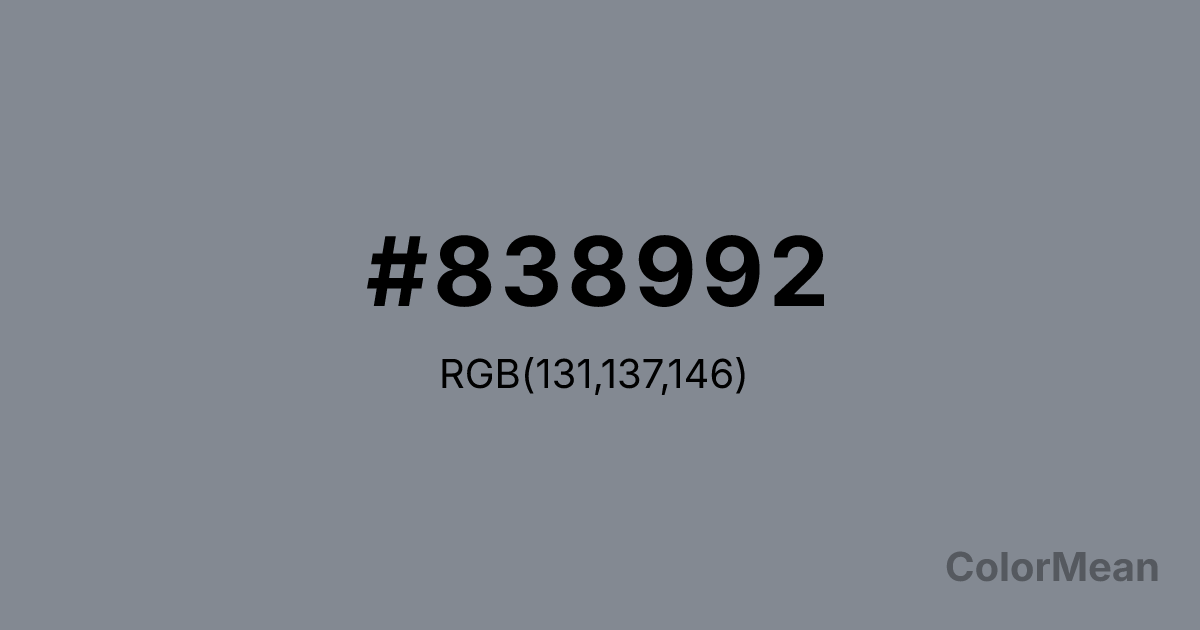 #838992 RGB value is (131, 137, 146). The hex color red value is 131, green is 137, and blue is 146. Its HSL format shows a hue of 216°, saturation of 6 percent, and lightness of 54 percent. The CMYK process values are 10 percent, 6 percent, 0 percent, 43 percent.