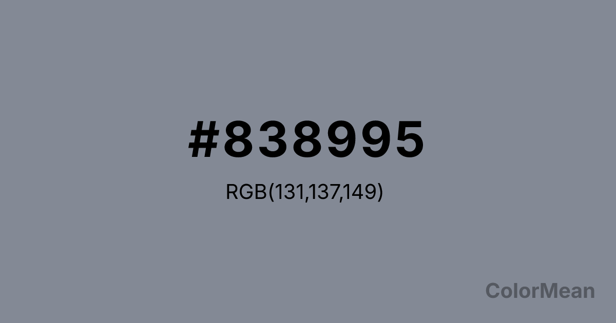 #838995 RGB value is (131, 137, 149). The hex color red value is 131, green is 137, and blue is 149. Its HSL format shows a hue of 220°, saturation of 8 percent, and lightness of 55 percent. The CMYK process values are 12 percent, 8 percent, 0 percent, 42 percent.