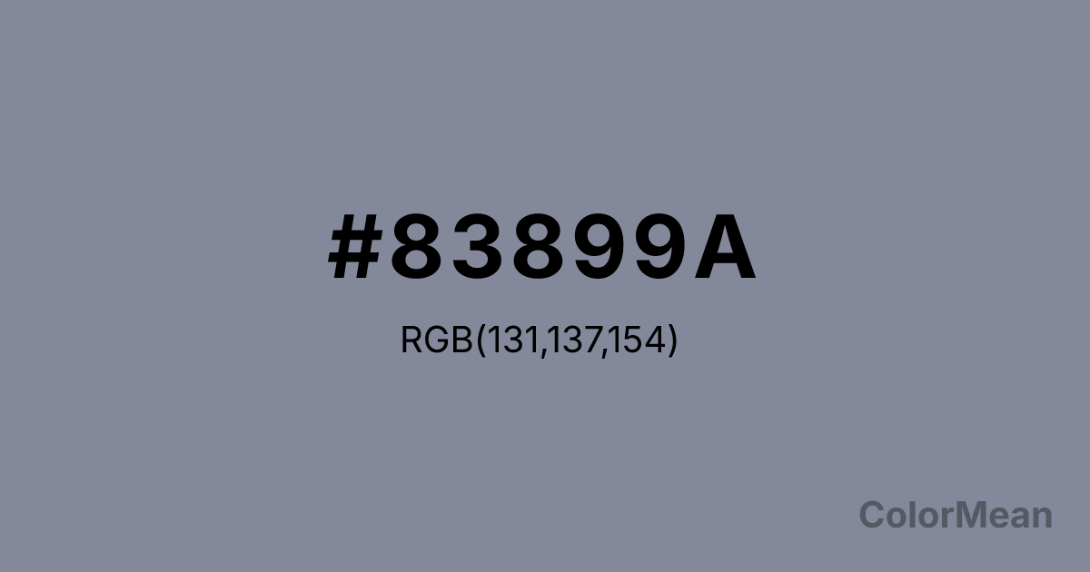 #83899A RGB value is (131, 137, 154). The hex color red value is 131, green is 137, and blue is 154. Its HSL format shows a hue of 224°, saturation of 10 percent, and lightness of 56 percent. The CMYK process values are 15 percent, 11 percent, 0 percent, 40 percent.