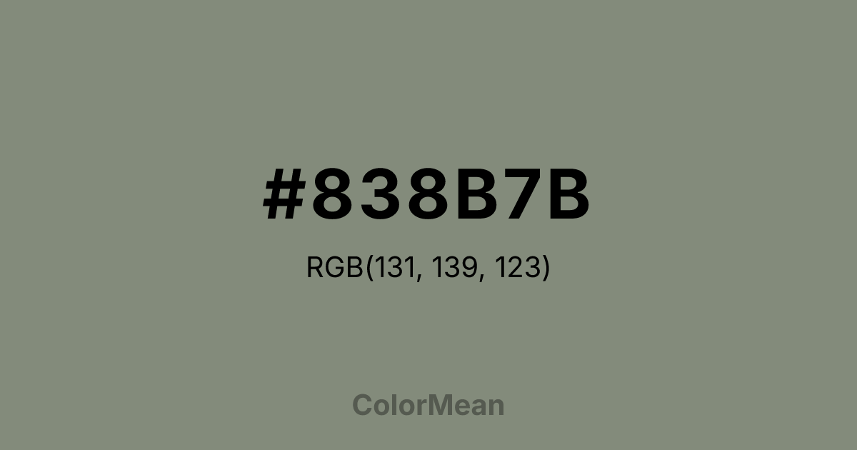 #838B7B RGB value is (131, 139, 123). The hex color red value is 131, green is 139, and blue is 123. Its HSL format shows a hue of 90°, saturation of 6 percent, and lightness of 51 percent. The CMYK process values are 6 percent, 0 percent, 12 percent, 45 percent.
