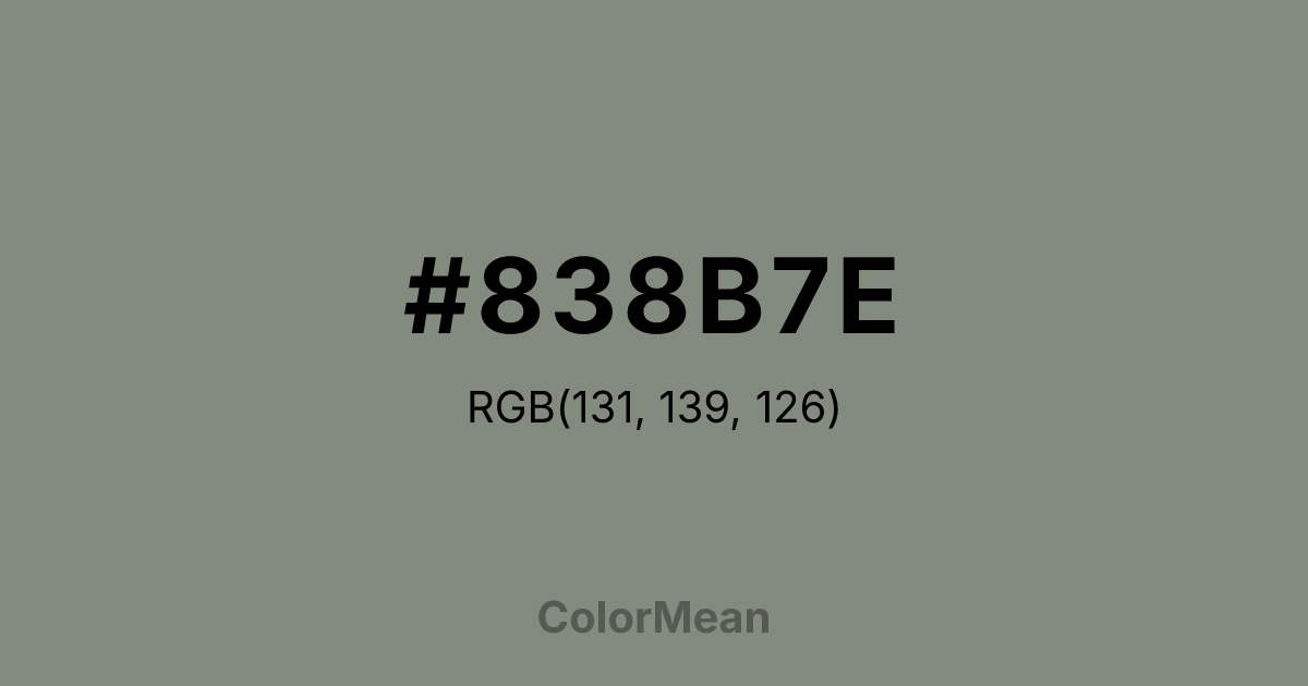 #838B7E RGB value is (131, 139, 126). The hex color red value is 131, green is 139, and blue is 126. Its HSL format shows a hue of 97°, saturation of 5 percent, and lightness of 52 percent. The CMYK process values are 6 percent, 0 percent, 9 percent, 45 percent.