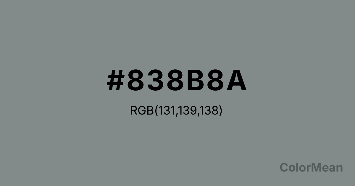 #838B8A RGB value is (131, 139, 138). The hex color red value is 131, green is 139, and blue is 138. Its HSL format shows a hue of 173°, saturation of 3 percent, and lightness of 53 percent. The CMYK process values are 6 percent, 0 percent, 1 percent, 45 percent.