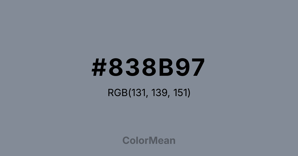 #838B97 RGB value is (131, 139, 151). The hex color red value is 131, green is 139, and blue is 151. Its HSL format shows a hue of 216°, saturation of 9 percent, and lightness of 55 percent. The CMYK process values are 13 percent, 8 percent, 0 percent, 41 percent.