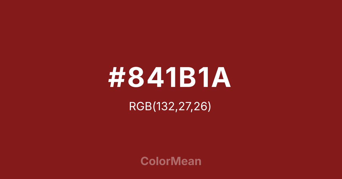 #841B1A RGB value is (132, 27, 26). The hex color red value is 132, green is 27, and blue is 26. Its HSL format shows a hue of 1°, saturation of 67 percent, and lightness of 31 percent. The CMYK process values are 0 percent, 80 percent, 80 percent, 48 percent.