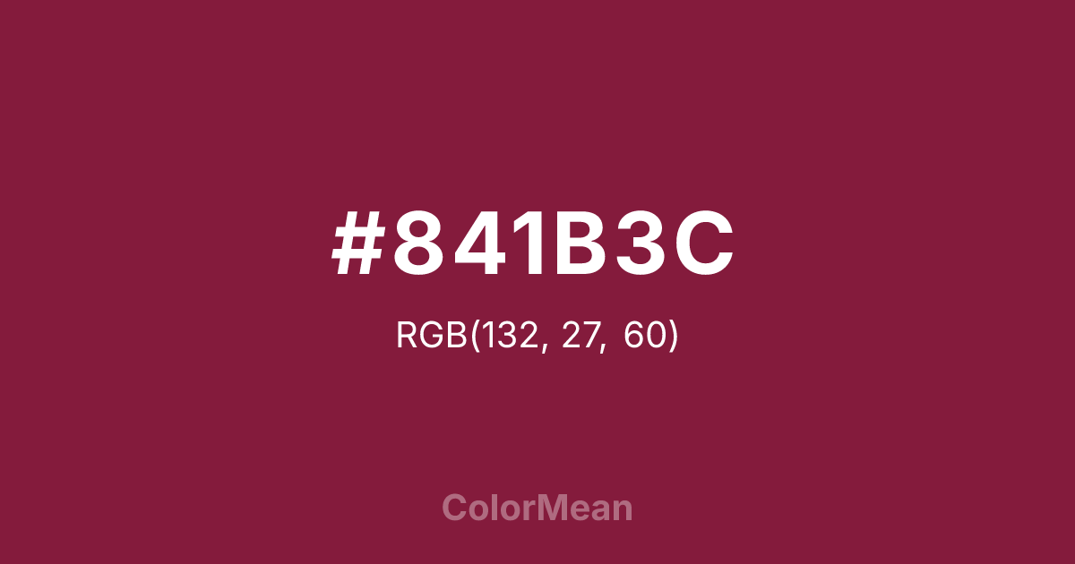 #841B3C RGB value is (132, 27, 60). The hex color red value is 132, green is 27, and blue is 60. Its HSL format shows a hue of 341°, saturation of 66 percent, and lightness of 31 percent. The CMYK process values are 0 percent, 80 percent, 55 percent, 48 percent.