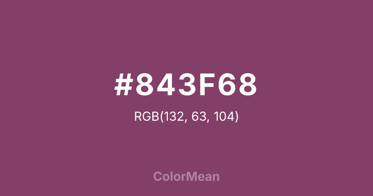 #843F68 RGB value is (132, 63, 104). The hex color red value is 132, green is 63, and blue is 104. Its HSL format shows a hue of 324°, saturation of 35 percent, and lightness of 38 percent. The CMYK process values are 0 percent, 52 percent, 21 percent, 48 percent.