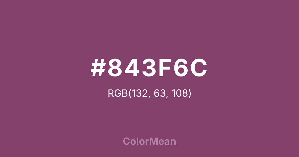 #843F6C RGB value is (132, 63, 108). The hex color red value is 132, green is 63, and blue is 108. Its HSL format shows a hue of 321°, saturation of 35 percent, and lightness of 38 percent. The CMYK process values are 0 percent, 52 percent, 18 percent, 48 percent.