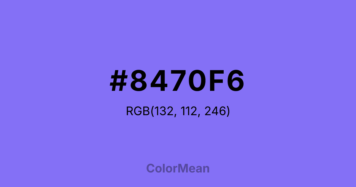 #8470F6 RGB value is (132, 112, 246). The hex color red value is 132, green is 112, and blue is 246. Its HSL format shows a hue of 249°, saturation of 88 percent, and lightness of 70 percent. The CMYK process values are 46 percent, 54 percent, 0 percent, 4 percent.
