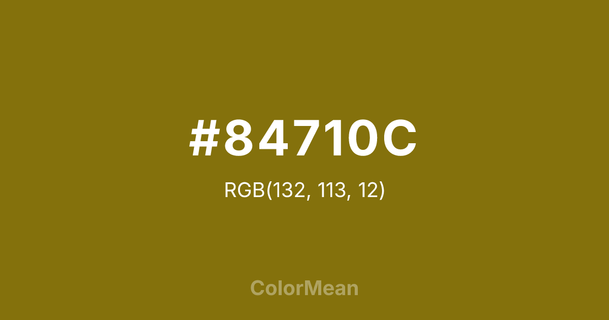 #84710C RGB value is (132, 113, 12). The hex color red value is 132, green is 113, and blue is 12. Its HSL format shows a hue of 50°, saturation of 83 percent, and lightness of 28 percent. The CMYK process values are 0 percent, 14 percent, 91 percent, 48 percent.