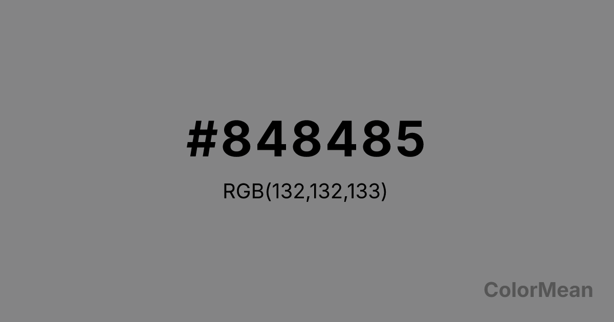 #848485 RGB value is (132, 132, 133). The hex color red value is 132, green is 132, and blue is 133. Its HSL format shows a hue of 240°, saturation of 0 percent, and lightness of 52 percent. The CMYK process values are 1 percent, 1 percent, 0 percent, 48 percent.
