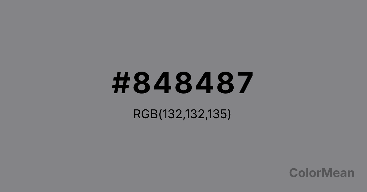 #848487 RGB value is (132, 132, 135). The hex color red value is 132, green is 132, and blue is 135. Its HSL format shows a hue of 240°, saturation of 1 percent, and lightness of 52 percent. The CMYK process values are 2 percent, 2 percent, 0 percent, 47 percent.