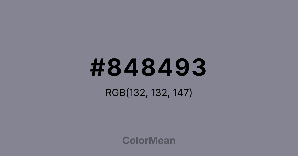 #848493 RGB value is (132, 132, 147). The hex color red value is 132, green is 132, and blue is 147. Its HSL format shows a hue of 240°, saturation of 6 percent, and lightness of 55 percent. The CMYK process values are 10 percent, 10 percent, 0 percent, 42 percent.