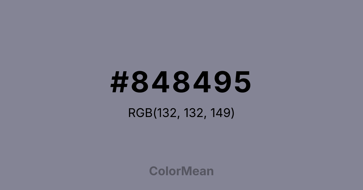 #848495 RGB value is (132, 132, 149). The hex color red value is 132, green is 132, and blue is 149. Its HSL format shows a hue of 240°, saturation of 7 percent, and lightness of 55 percent. The CMYK process values are 11 percent, 11 percent, 0 percent, 42 percent.