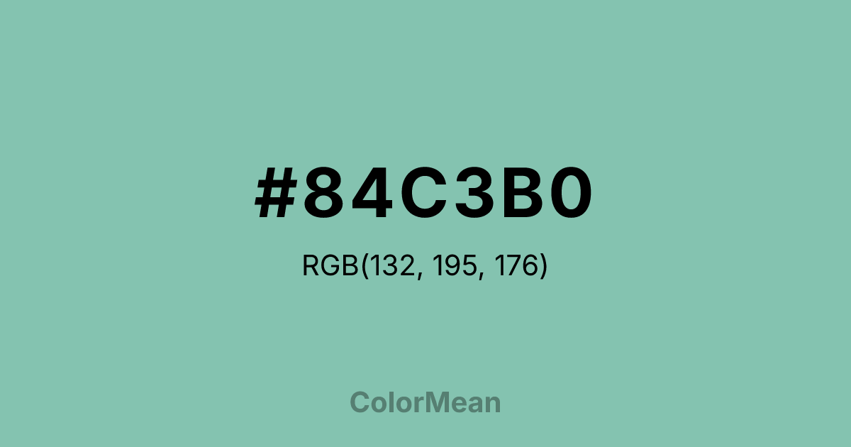 #84C3B0 RGB value is (132, 195, 176). The hex color red value is 132, green is 195, and blue is 176. Its HSL format shows a hue of 162°, saturation of 34 percent, and lightness of 64 percent. The CMYK process values are 32 percent, 0 percent, 10 percent, 24 percent.