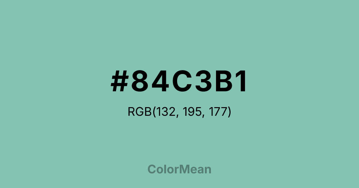 #84C3B1 RGB value is (132, 195, 177). The hex color red value is 132, green is 195, and blue is 177. Its HSL format shows a hue of 163°, saturation of 34 percent, and lightness of 64 percent. The CMYK process values are 32 percent, 0 percent, 9 percent, 24 percent.