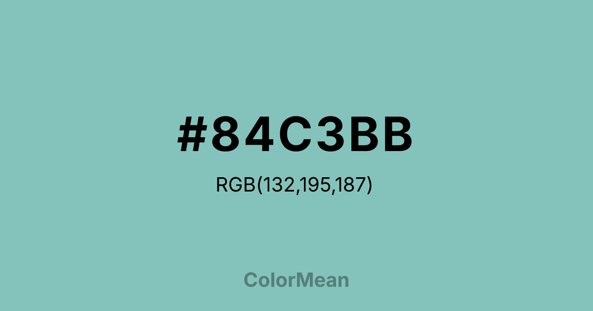 #84C3BB RGB value is (132, 195, 187). The hex color red value is 132, green is 195, and blue is 187. Its HSL format shows a hue of 172°, saturation of 34 percent, and lightness of 64 percent. The CMYK process values are 32 percent, 0 percent, 4 percent, 24 percent.
