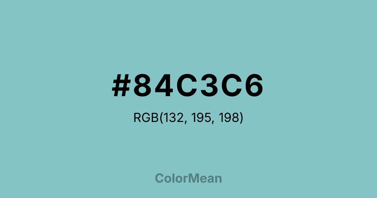 #84C3C6 RGB value is (132, 195, 198). The hex color red value is 132, green is 195, and blue is 198. Its HSL format shows a hue of 183°, saturation of 37 percent, and lightness of 65 percent. The CMYK process values are 33 percent, 2 percent, 0 percent, 22 percent.