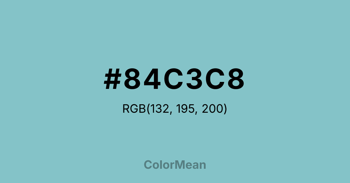 #84C3C8 RGB value is (132, 195, 200). The hex color red value is 132, green is 195, and blue is 200. Its HSL format shows a hue of 184°, saturation of 38 percent, and lightness of 65 percent. The CMYK process values are 34 percent, 3 percent, 0 percent, 22 percent.