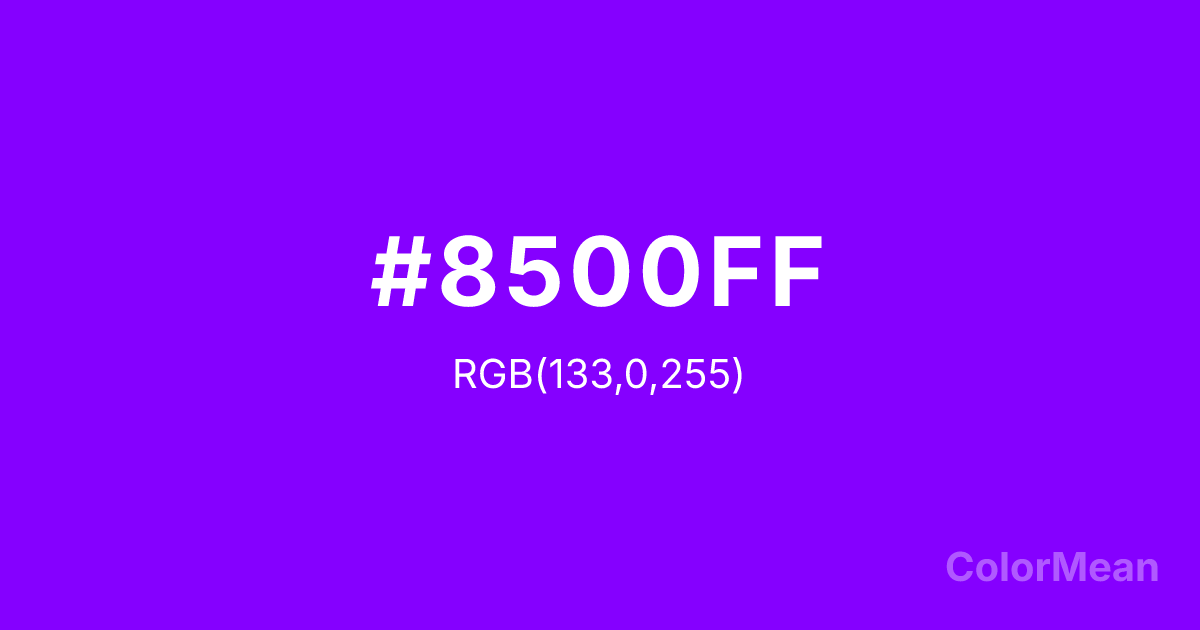 #8500FF RGB value is (133, 0, 255). The hex color red value is 133, green is 0, and blue is 255. Its HSL format shows a hue of 271°, saturation of 100 percent, and lightness of 50 percent. The CMYK process values are 48 percent, 100 percent, 0 percent, 0 percent.