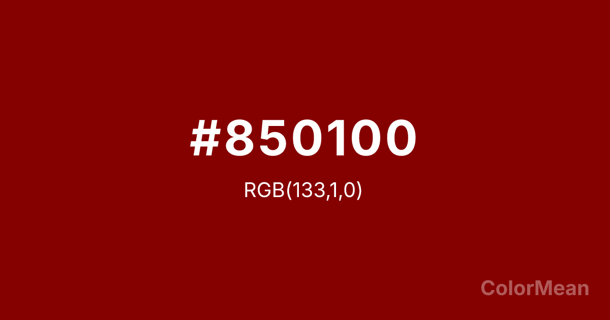 #850100 RGB value is (133, 1, 0). The hex color red value is 133, green is 1, and blue is 0. Its HSL format shows a hue of 0°, saturation of 100 percent, and lightness of 26 percent. The CMYK process values are 0 percent, 99 percent, 100 percent, 48 percent.