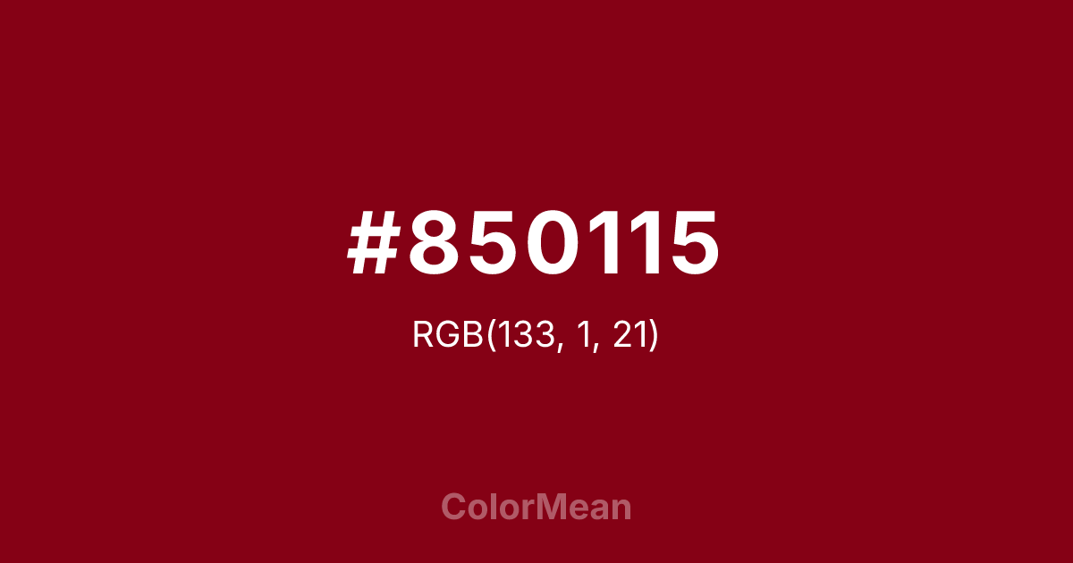 #850115 RGB value is (133, 1, 21). The hex color red value is 133, green is 1, and blue is 21. Its HSL format shows a hue of 351°, saturation of 99 percent, and lightness of 26 percent. The CMYK process values are 0 percent, 99 percent, 84 percent, 48 percent.