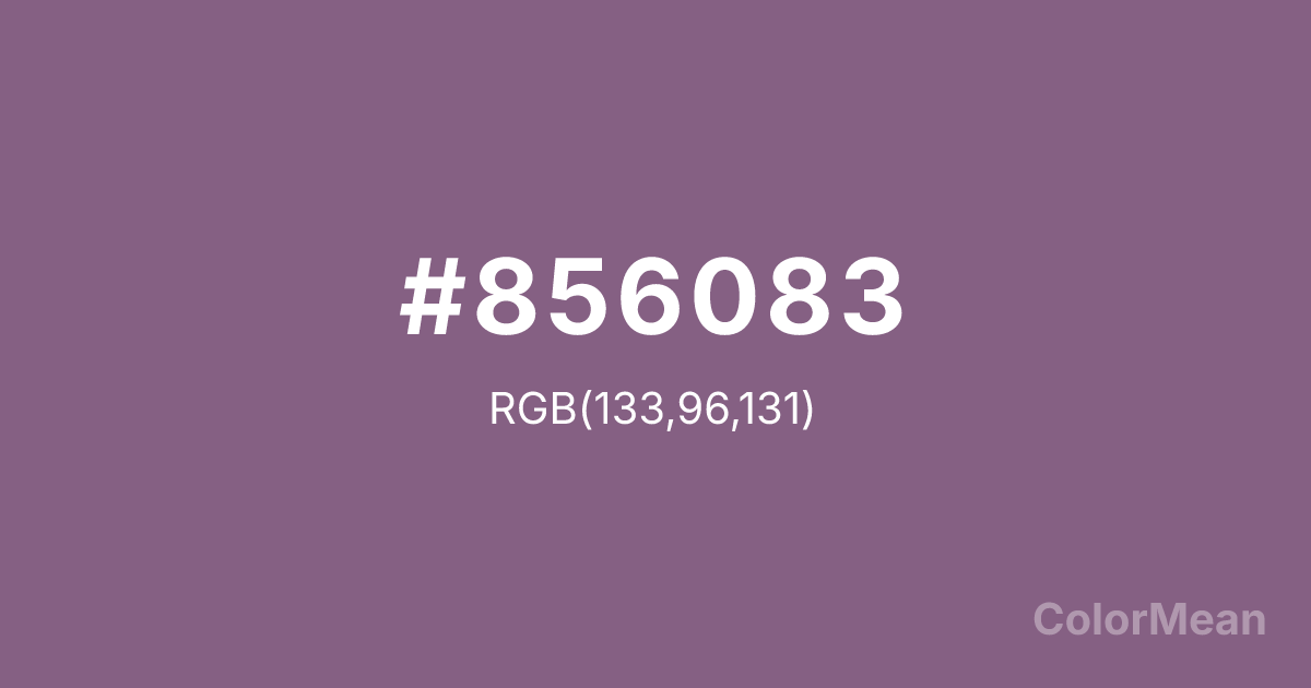 #856083 RGB value is (133, 96, 131). The hex color red value is 133, green is 96, and blue is 131. Its HSL format shows a hue of 303°, saturation of 16 percent, and lightness of 45 percent. The CMYK process values are 0 percent, 28 percent, 2 percent, 48 percent.