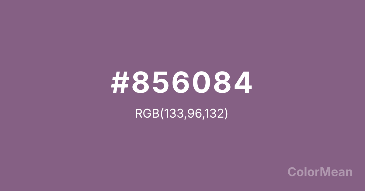 #856084 RGB value is (133, 96, 132). The hex color red value is 133, green is 96, and blue is 132. Its HSL format shows a hue of 302°, saturation of 16 percent, and lightness of 45 percent. The CMYK process values are 0 percent, 28 percent, 1 percent, 48 percent.