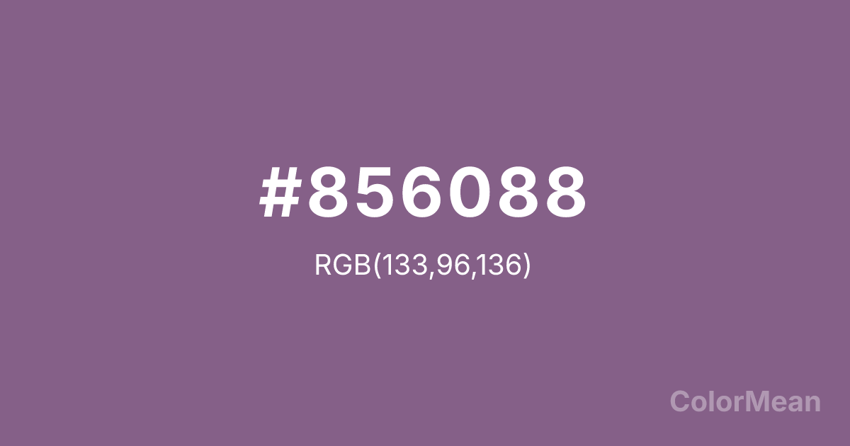 Chinese Violet (#856088) RGB value is (133, 96, 136). The hex color red value is 133, green is 96, and blue is 136. Its HSL format shows a hue of 296°, saturation of 17 percent, and lightness of 45 percent. The CMYK process values are 2 percent, 29 percent, 0 percent, 47 percent.