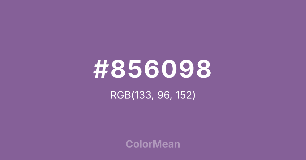 #856098 RGB value is (133, 96, 152). The hex color red value is 133, green is 96, and blue is 152. Its HSL format shows a hue of 280°, saturation of 23 percent, and lightness of 49 percent. The CMYK process values are 12 percent, 37 percent, 0 percent, 40 percent.