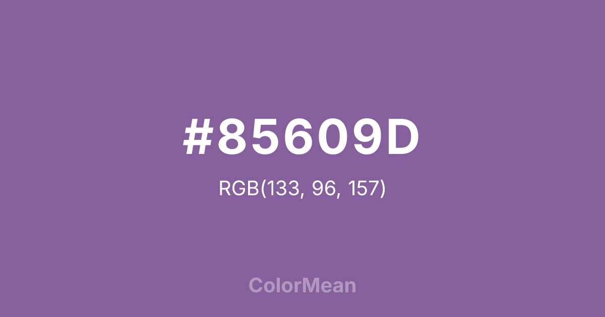 #85609D RGB value is (133, 96, 157). The hex color red value is 133, green is 96, and blue is 157. Its HSL format shows a hue of 276°, saturation of 24 percent, and lightness of 50 percent. The CMYK process values are 15 percent, 39 percent, 0 percent, 38 percent.