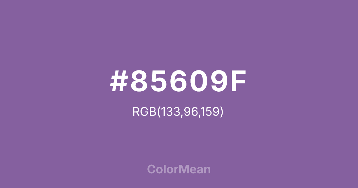 #85609F RGB value is (133, 96, 159). The hex color red value is 133, green is 96, and blue is 159. Its HSL format shows a hue of 275°, saturation of 25 percent, and lightness of 50 percent. The CMYK process values are 16 percent, 40 percent, 0 percent, 38 percent.