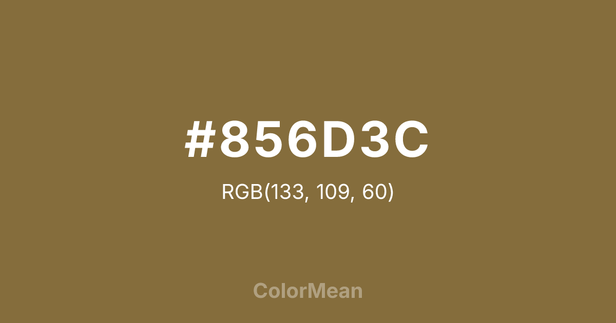 #856D3C RGB value is (133, 109, 60). The hex color red value is 133, green is 109, and blue is 60. Its HSL format shows a hue of 40°, saturation of 38 percent, and lightness of 38 percent. The CMYK process values are 0 percent, 18 percent, 55 percent, 48 percent.
