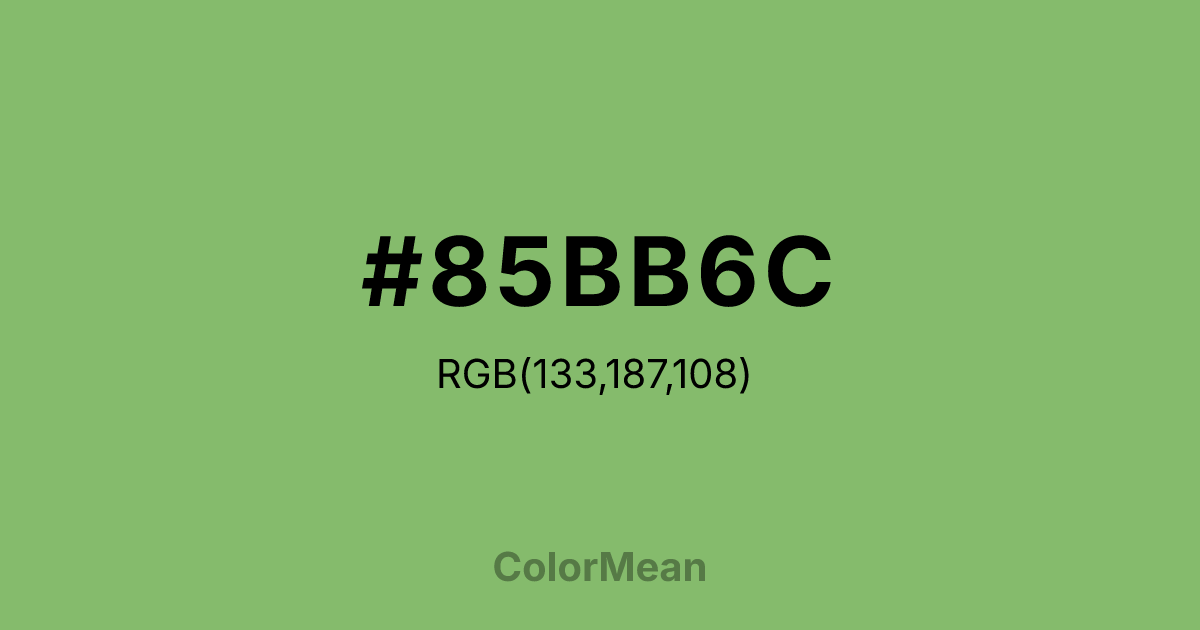 #85BB6C RGB value is (133, 187, 108). The hex color red value is 133, green is 187, and blue is 108. Its HSL format shows a hue of 101°, saturation of 37 percent, and lightness of 58 percent. The CMYK process values are 29 percent, 0 percent, 42 percent, 27 percent.
