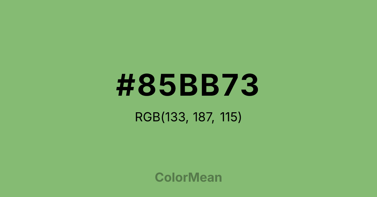 #85BB73 RGB value is (133, 187, 115). The hex color red value is 133, green is 187, and blue is 115. Its HSL format shows a hue of 105°, saturation of 35 percent, and lightness of 59 percent. The CMYK process values are 29 percent, 0 percent, 39 percent, 27 percent.