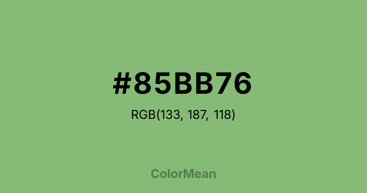 #85BB76 RGB value is (133, 187, 118). The hex color red value is 133, green is 187, and blue is 118. Its HSL format shows a hue of 107°, saturation of 34 percent, and lightness of 60 percent. The CMYK process values are 29 percent, 0 percent, 37 percent, 27 percent.