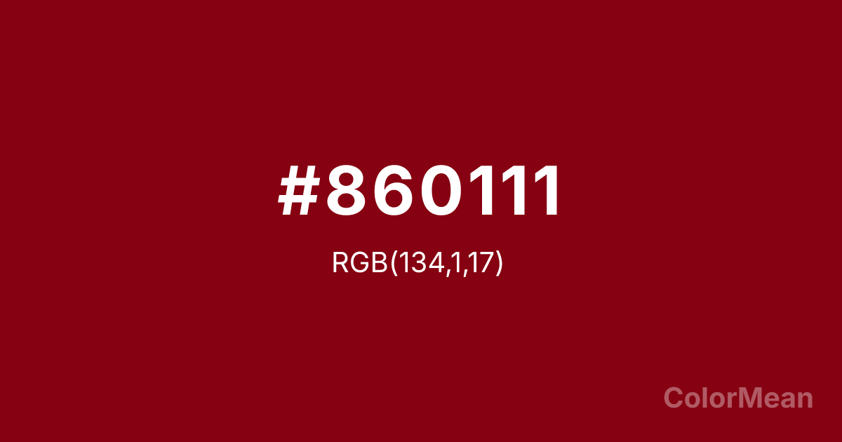 Red Devil (#860111) RGB value is (134, 1, 17). The hex color red value is 134, green is 1, and blue is 17. Its HSL format shows a hue of 353°, saturation of 99 percent, and lightness of 26 percent. The CMYK process values are 0 percent, 99 percent, 87 percent, 47 percent.