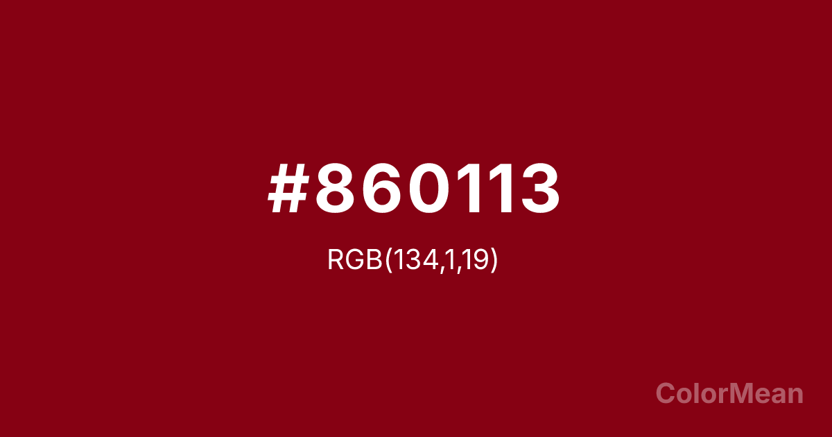 #860113 RGB value is (134, 1, 19). The hex color red value is 134, green is 1, and blue is 19. Its HSL format shows a hue of 352°, saturation of 99 percent, and lightness of 26 percent. The CMYK process values are 0 percent, 99 percent, 86 percent, 47 percent.
