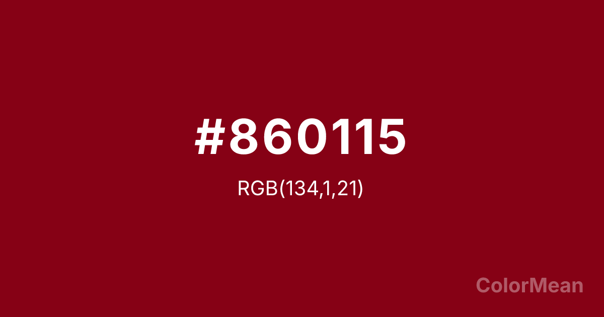 #860115 RGB value is (134, 1, 21). The hex color red value is 134, green is 1, and blue is 21. Its HSL format shows a hue of 351°, saturation of 99 percent, and lightness of 26 percent. The CMYK process values are 0 percent, 99 percent, 84 percent, 47 percent.
