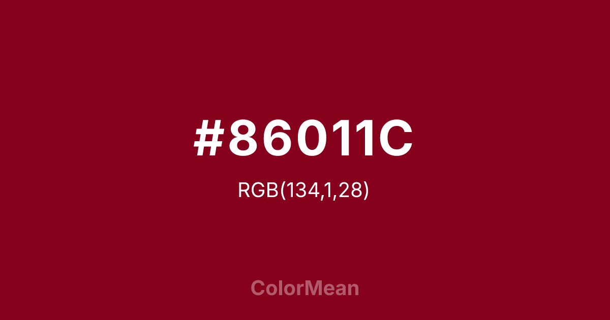 #86011C RGB value is (134, 1, 28). The hex color red value is 134, green is 1, and blue is 28. Its HSL format shows a hue of 348°, saturation of 99 percent, and lightness of 26 percent. The CMYK process values are 0 percent, 99 percent, 79 percent, 47 percent.