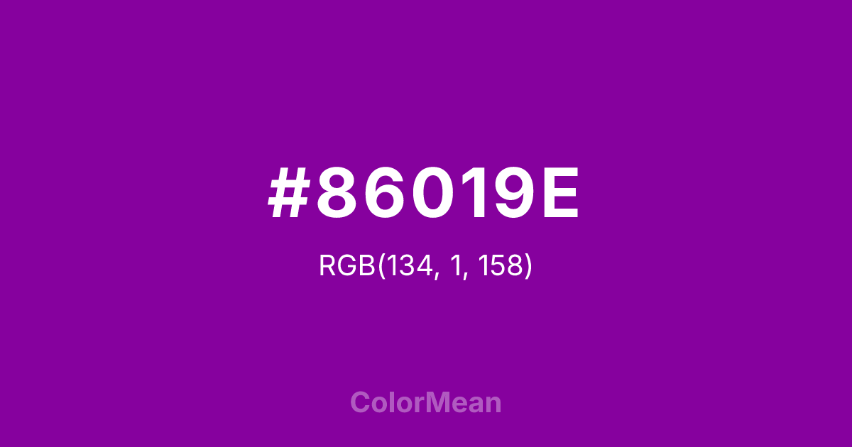 #86019E RGB value is (134, 1, 158). The hex color red value is 134, green is 1, and blue is 158. Its HSL format shows a hue of 291°, saturation of 99 percent, and lightness of 31 percent. The CMYK process values are 15 percent, 99 percent, 0 percent, 38 percent.