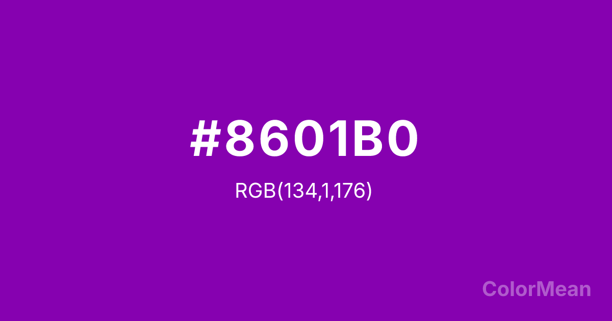 #8601B0 RGB value is (134, 1, 176). The hex color red value is 134, green is 1, and blue is 176. Its HSL format shows a hue of 286°, saturation of 99 percent, and lightness of 35 percent. The CMYK process values are 24 percent, 99 percent, 0 percent, 31 percent.