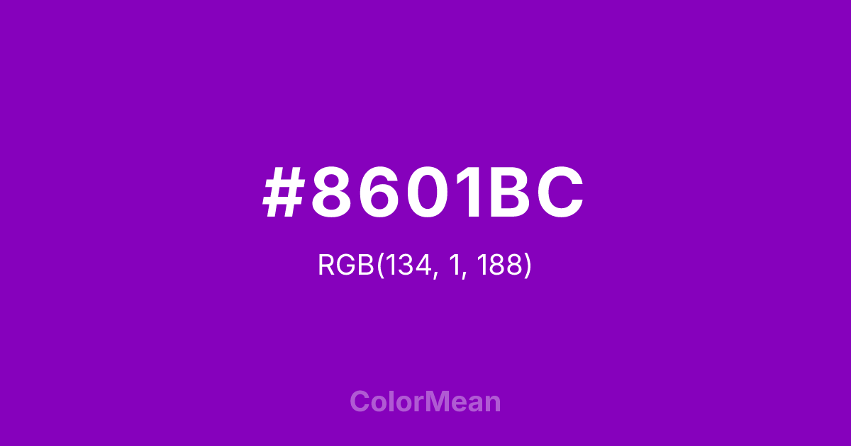 #8601BC RGB value is (134, 1, 188). The hex color red value is 134, green is 1, and blue is 188. Its HSL format shows a hue of 283°, saturation of 99 percent, and lightness of 37 percent. The CMYK process values are 29 percent, 99 percent, 0 percent, 26 percent.