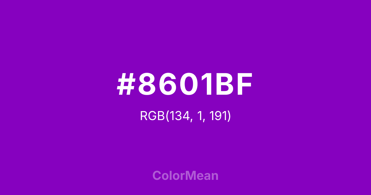 #8601BF RGB value is (134, 1, 191). The hex color red value is 134, green is 1, and blue is 191. Its HSL format shows a hue of 282°, saturation of 99 percent, and lightness of 38 percent. The CMYK process values are 30 percent, 99 percent, 0 percent, 25 percent.