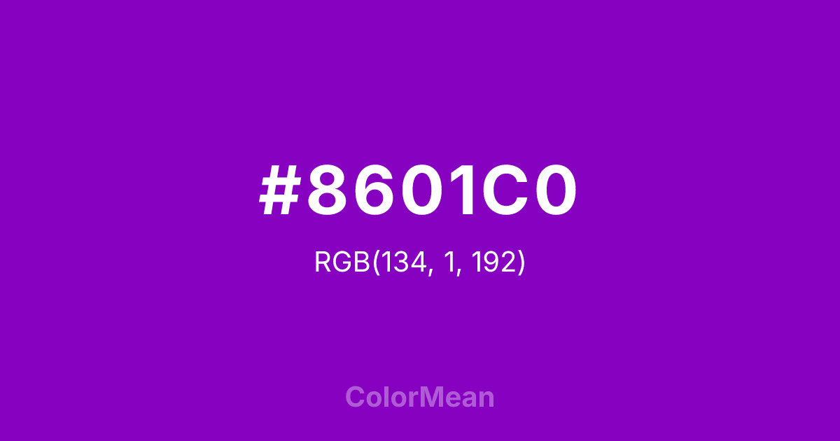 #8601C0 RGB value is (134, 1, 192). The hex color red value is 134, green is 1, and blue is 192. Its HSL format shows a hue of 282°, saturation of 99 percent, and lightness of 38 percent. The CMYK process values are 30 percent, 99 percent, 0 percent, 25 percent.
