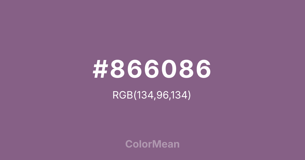 #866086 RGB value is (134, 96, 134). The hex color red value is 134, green is 96, and blue is 134. Its HSL format shows a hue of 300°, saturation of 17 percent, and lightness of 45 percent. The CMYK process values are 0 percent, 28 percent, 0 percent, 47 percent.