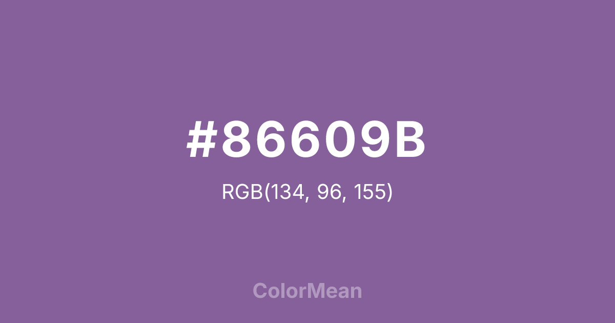 #86609B RGB value is (134, 96, 155). The hex color red value is 134, green is 96, and blue is 155. Its HSL format shows a hue of 279°, saturation of 24 percent, and lightness of 49 percent. The CMYK process values are 14 percent, 38 percent, 0 percent, 39 percent.