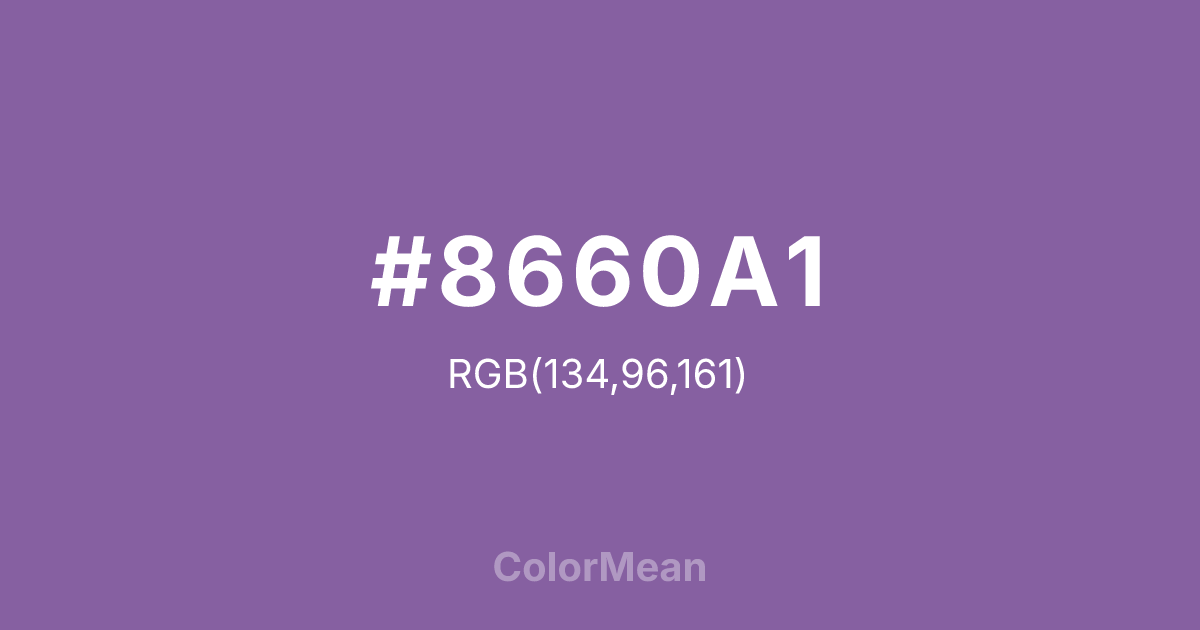 #8660A1 RGB value is (134, 96, 161). The hex color red value is 134, green is 96, and blue is 161. Its HSL format shows a hue of 275°, saturation of 26 percent, and lightness of 50 percent. The CMYK process values are 17 percent, 40 percent, 0 percent, 37 percent.
