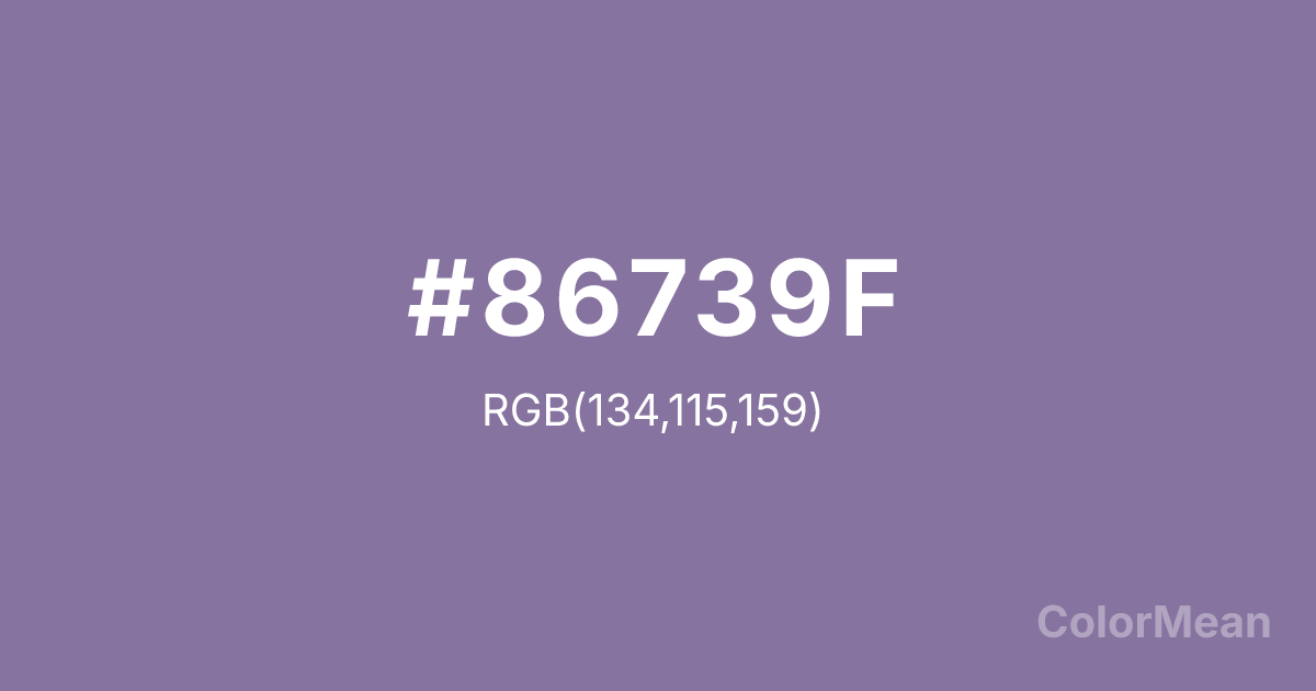 #86739F RGB value is (134, 115, 159). The hex color red value is 134, green is 115, and blue is 159. Its HSL format shows a hue of 266°, saturation of 19 percent, and lightness of 54 percent. The CMYK process values are 16 percent, 28 percent, 0 percent, 38 percent.