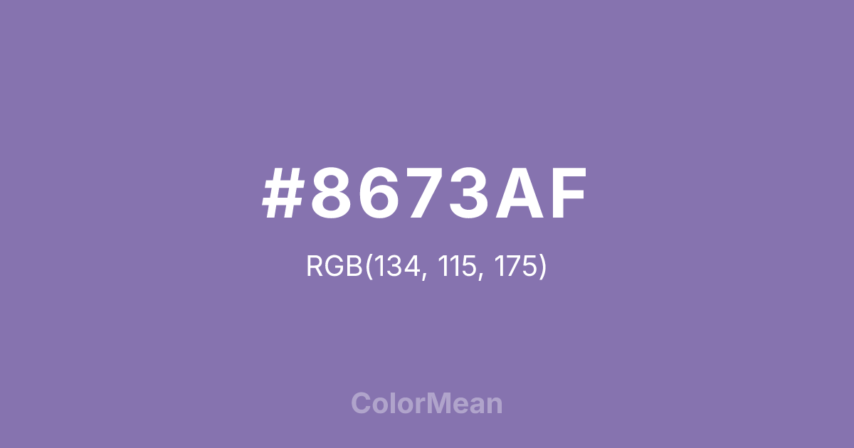 #8673AF RGB value is (134, 115, 175). The hex color red value is 134, green is 115, and blue is 175. Its HSL format shows a hue of 259°, saturation of 27 percent, and lightness of 57 percent. The CMYK process values are 23 percent, 34 percent, 0 percent, 31 percent.