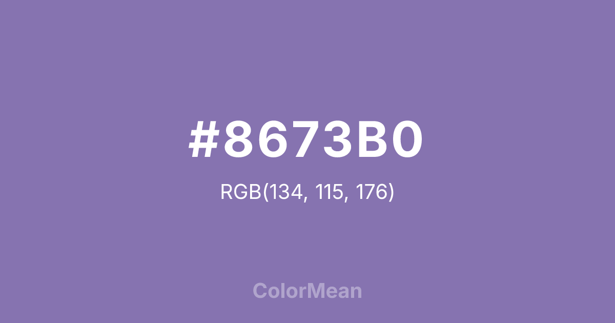 #8673B0 RGB value is (134, 115, 176). The hex color red value is 134, green is 115, and blue is 176. Its HSL format shows a hue of 259°, saturation of 28 percent, and lightness of 57 percent. The CMYK process values are 24 percent, 35 percent, 0 percent, 31 percent.